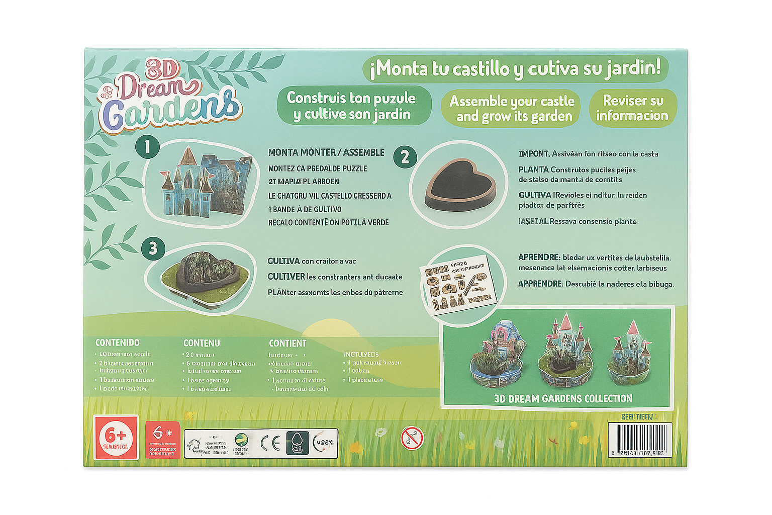 Mit dem EDUCA 3D Dream Gardens Set können Kinder ihr Kreativitäts- und Umweltbewusstsein spielerisch fördern. Das Set kombiniert Bastelspaß mit Naturerfahrung – einfach das Schloss aus stabilen Kartonteilen zusammenbauen, Erde und Samen hinzufügen und den Pflanzen beim Wachsen zusehen.